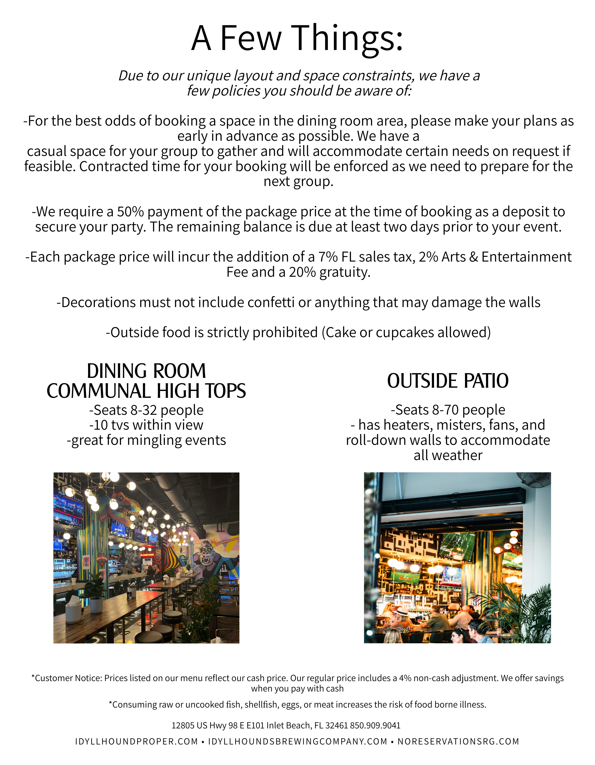 INQUIREIf you're just looking to join us for brunch, lunch, or dinner outside of a special event please email us at hello@idyllhoundproper.com or call 850-909-9041 and we will accommodate you as best we can.